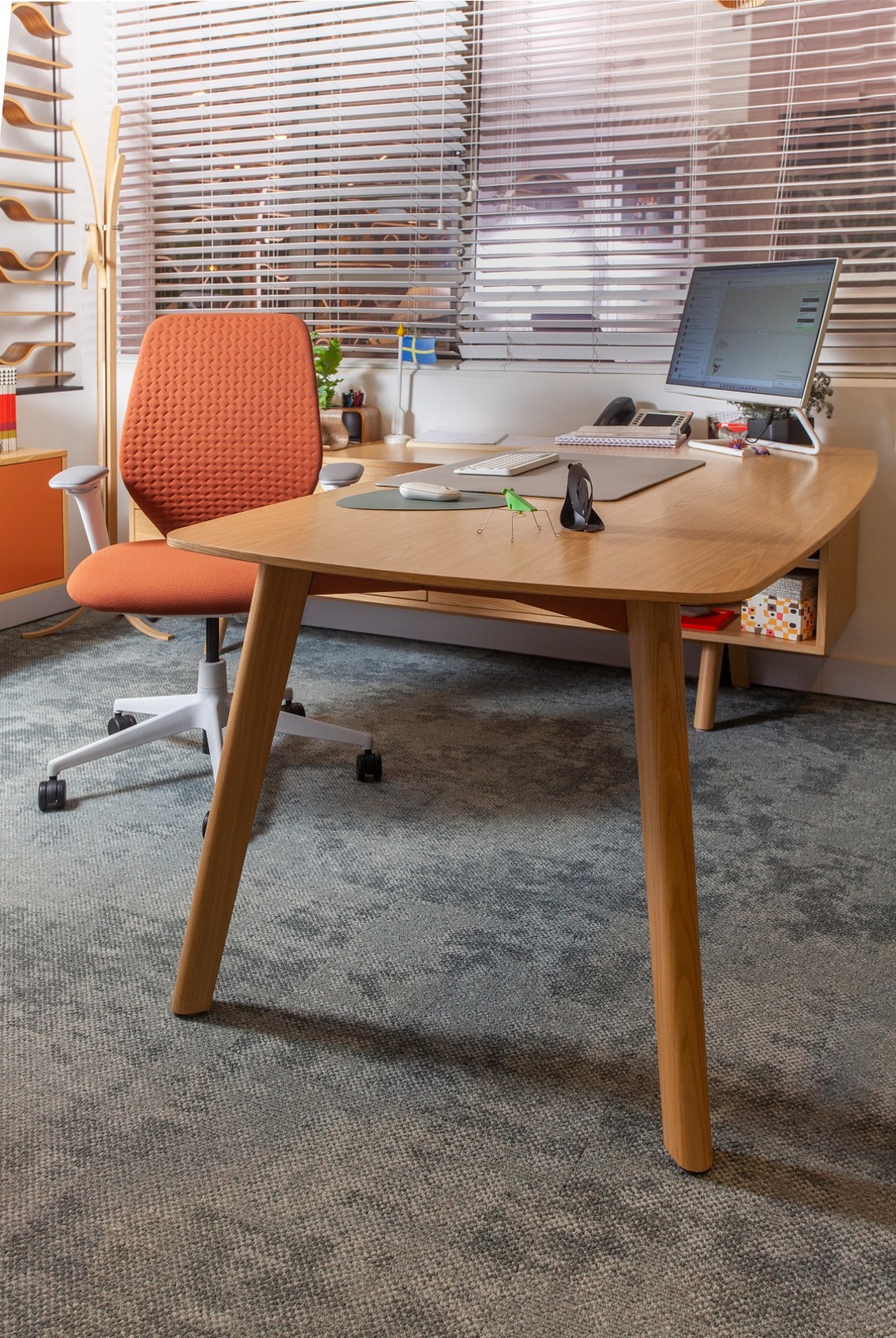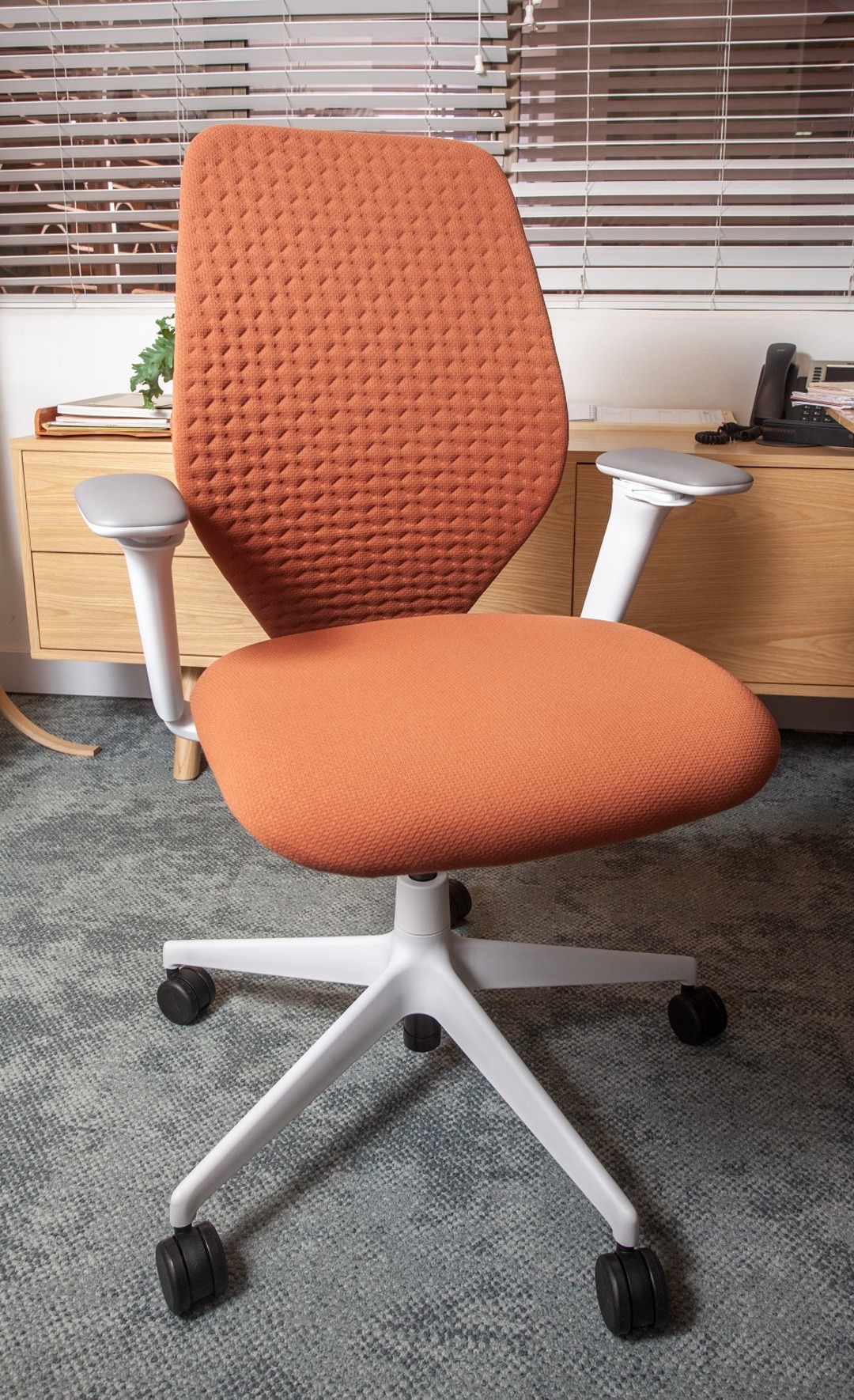 Su principal característica es el respaldo que tiene una funda de punto acolchado. Este cómodo y suave tejido de poliéster reciclado le da a la silla su aspecto especialmente acogedor. Disponible en varios colores, se puede combinar con un bastidor claro u oscuro, lo que permite una amplia variedad de configuraciones.